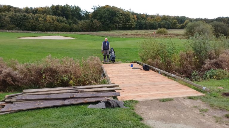 Der er gang i forbedringer og forskønnelser på banen her i efteråret. Først blev buske, træer og en stor, væltet træstamme i søen ved hul 9 fjernet, så søen er kommet rigtig til sin ret. Så kom den nye bro…